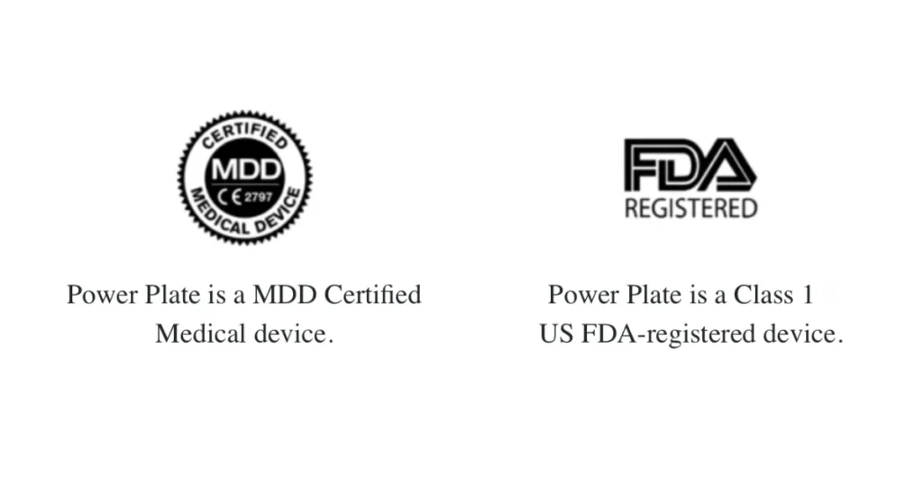 Power Plate® je registrovan od strane međunarodnih administacija: FDA i MDD i jedini je uređaj na svetu koji poseduje oba sertifikata i medicinske akreditacije, što potvrđuje njegovu bezbednost, kvalitet i pouzdanost u primeni. Ova zvanična registracija znači da Power Plate ispunjava stroge međunarodne standarde za upotrebu u oblasti zdravlja, rehabilitacije, profesionalnog sporta i fitnesa.